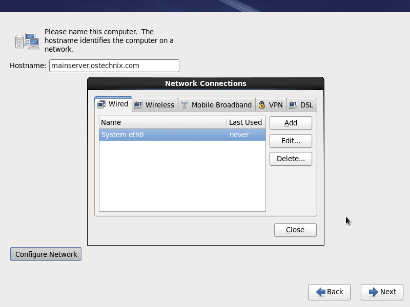 Enter the IP address for your server by clicking the “configure Network”, Select your Network interface and enter the IP, Subnet details and Apply the changes.: